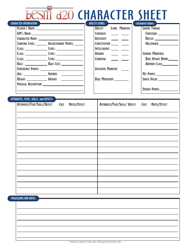 D20 besm character sheet fillable besm character sheet scribd. After you finish learning/mastering the system, its not really needed. The besm classes work just like regular d20 classes.