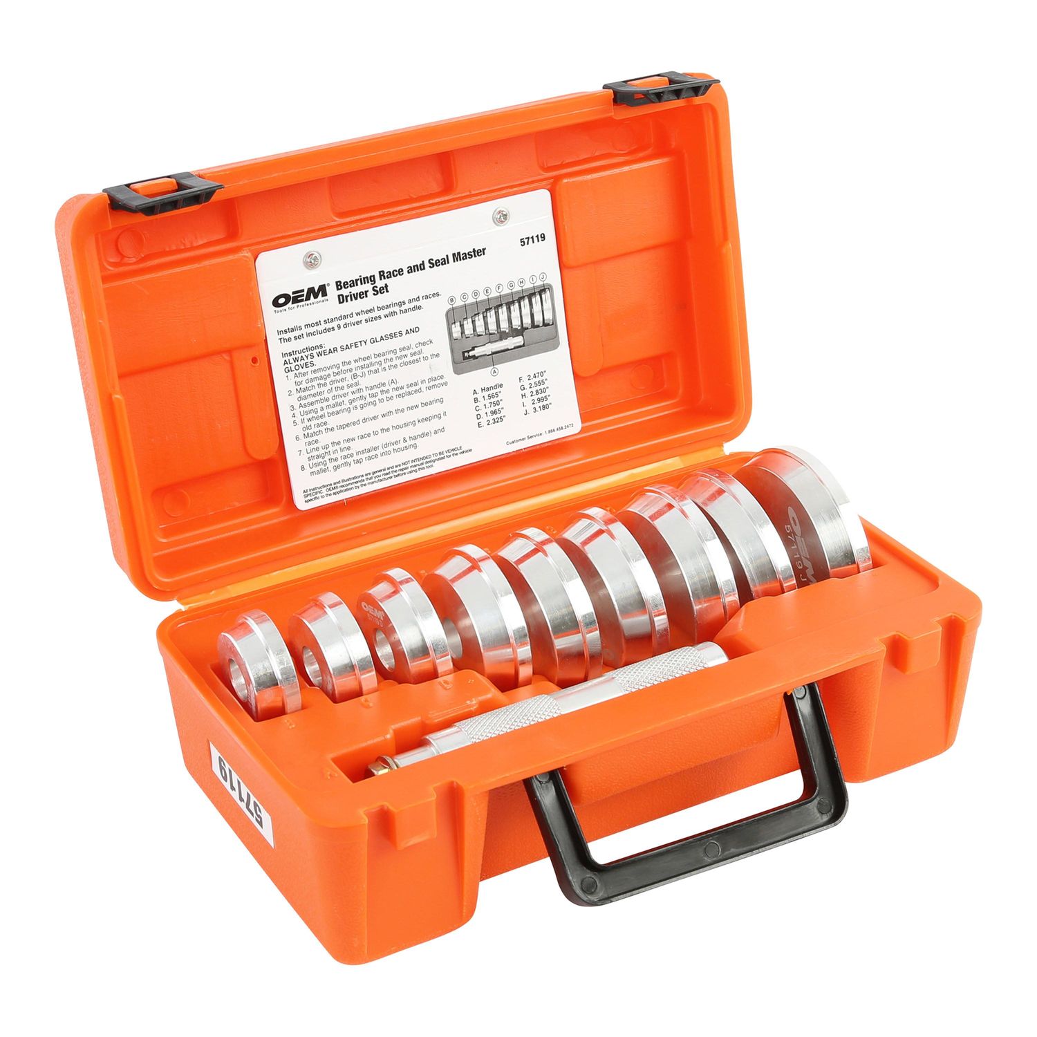 Includes a driver handle plus popular bearing and seal drivers, ranging from 1.565 to 3.180. Orion motor tech bearing race and seal bushing driver install set 9 discs collar axle housing with carrying case master/universal aluminum bush drive seal kit for automotive wheel bearings. Heavy duty bearing and seal driver set.